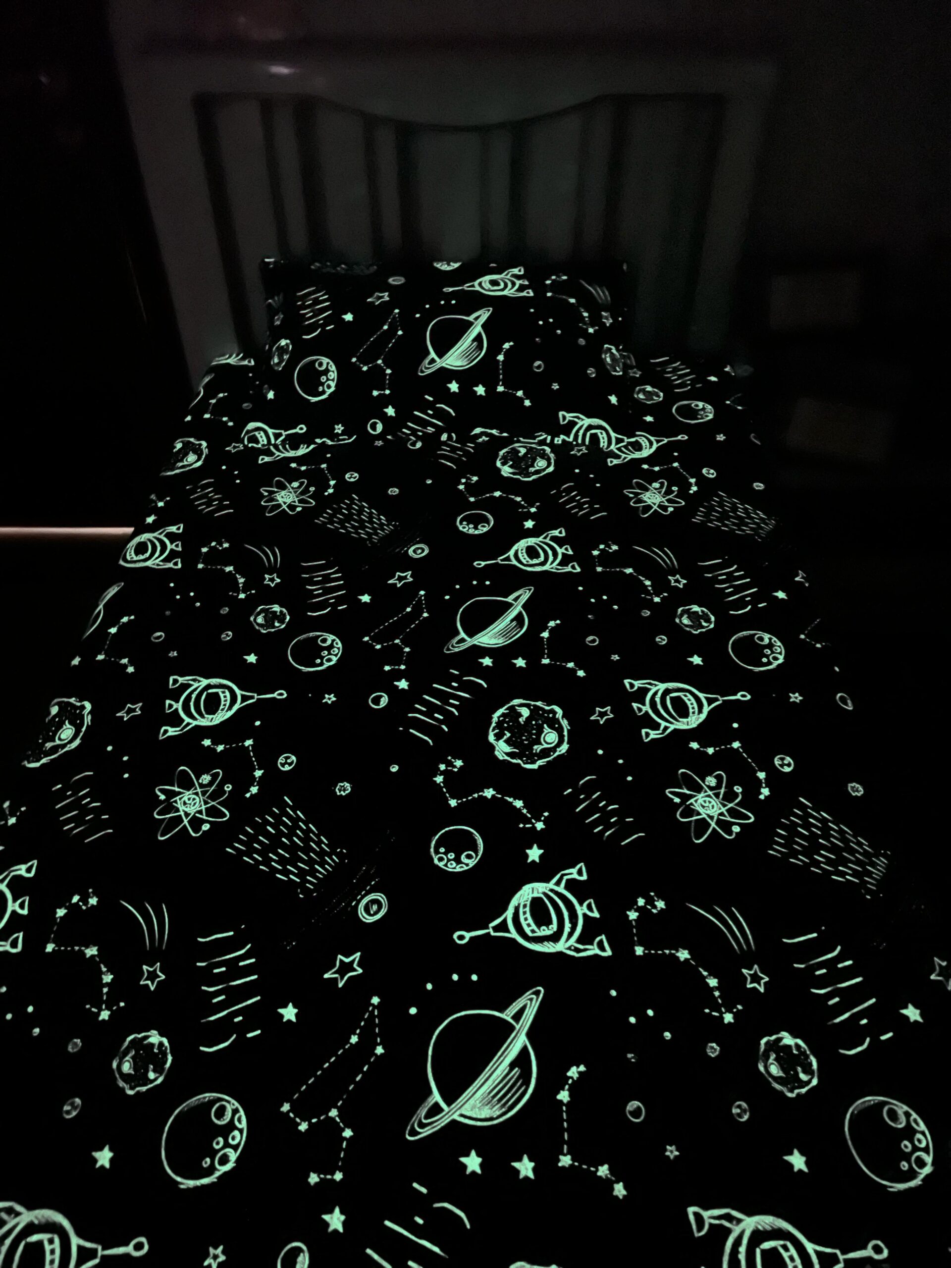 The bed sheets absorb light during the day (from natural sunlight or room lighting) and glow softly when the lights are turned off, creating a soothing, dreamlike ambiance in your room at night.
